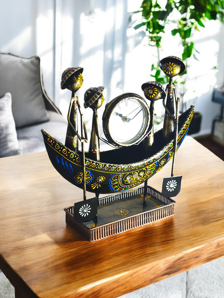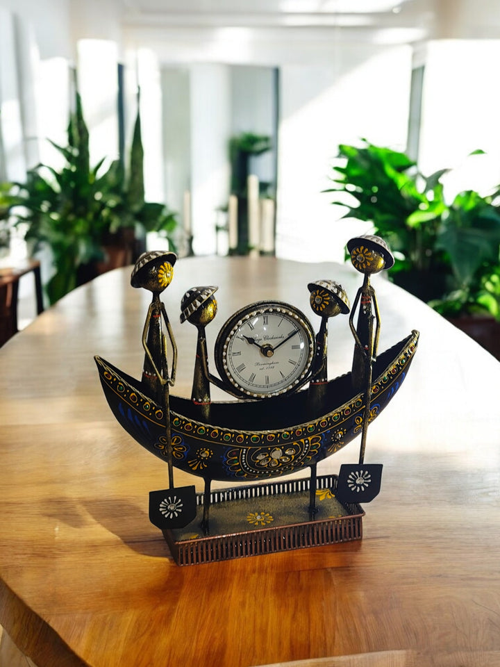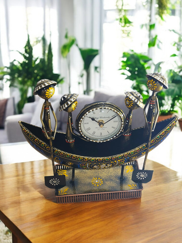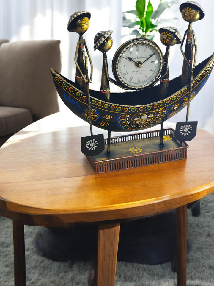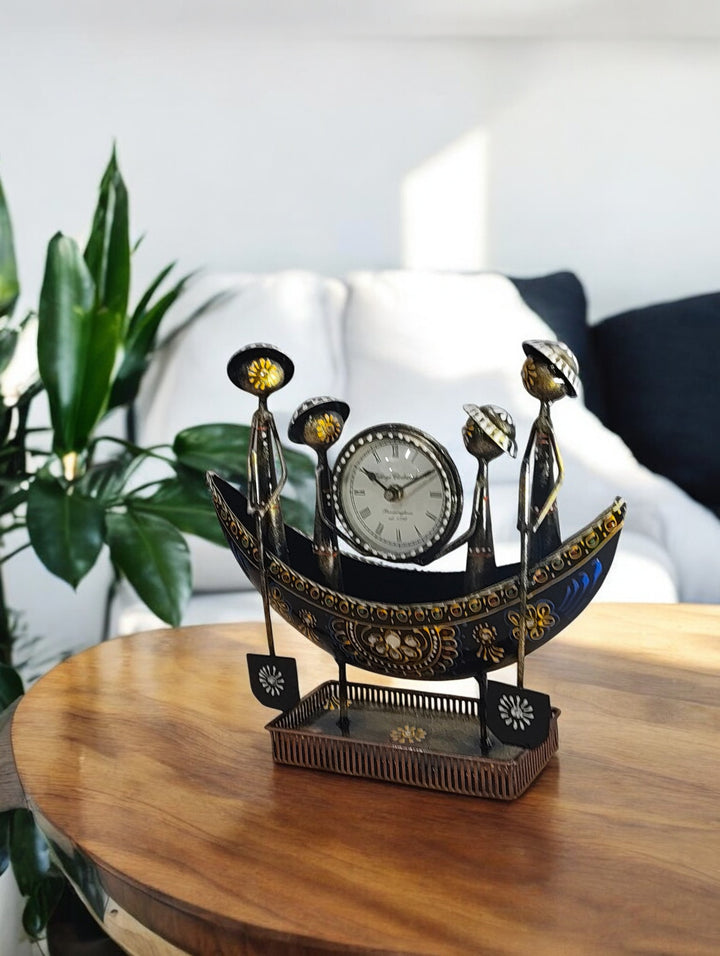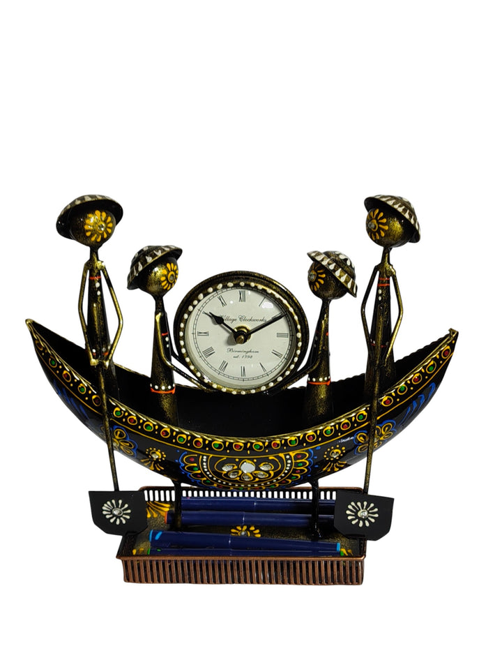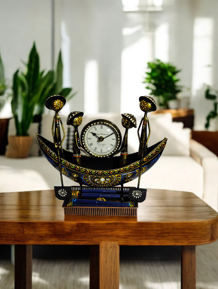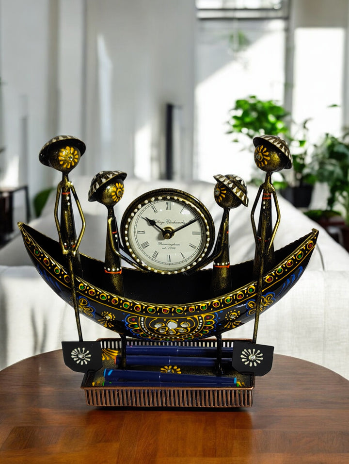 Sail away from desk clutter with this unique handcrafted metal boat showpiece. This beautiful piece is more than just a decorative item; it's a functional desk organizer featuring a working clock and a pen holder. The boat is adorned with four miniature musician dolls, all in traditional attire, adding a touch of Indian folk art to your workspace.