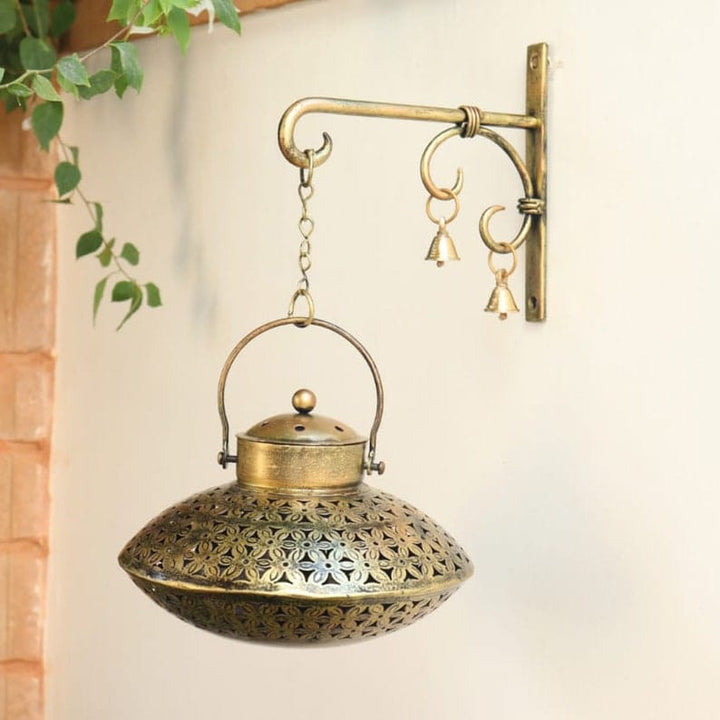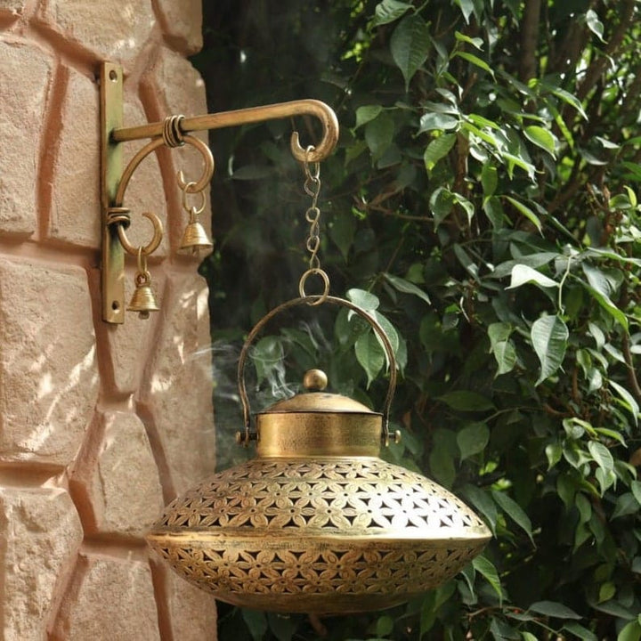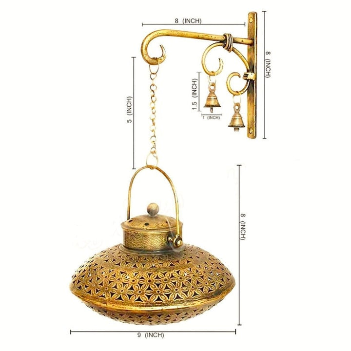 Degchi Pot : Diameter 23 cm x Height !5 cm | Hanger : 18cm x 2cm x 18cm | Brass bells : Diameter 2.5 cm x Height 4 cm | Chain : 15cm